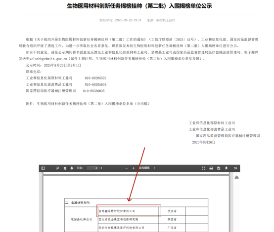 2025年8月26日,工業(yè)和信息化部聯(lián)合國家藥品監(jiān)督管理局發(fā)布《生物醫(yī)用材料創(chuàng)新任務(wù)揭榜掛帥(第二批)入圍揭榜單位公示》,寶雞鑫諾特材股份有限公司(以下簡稱“鑫諾特材”)憑借在超細(xì)晶鈦棒絲材領(lǐng)域的技術(shù)突破,成功入圍金屬材料方向項目名單。此次入圍標(biāo)志著鑫諾特材在高端生物醫(yī)用材料領(lǐng)域的技術(shù)實力獲得國家級認(rèn)可,也為我國突破醫(yī)用鈦合金關(guān)鍵核心技術(shù)、推動高端醫(yī)療器械自主可控提供了重要支撐。